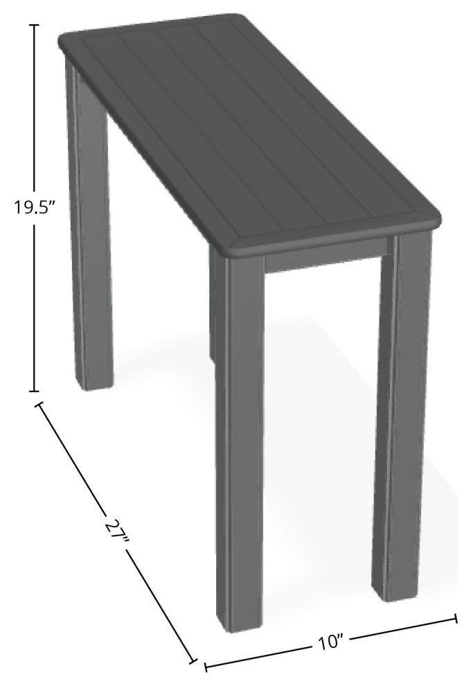 Marine Grade Polymer Top Tables combine modern design with unmatched durability for outdoor living. With options in coffee, chat, dining, accessory, balcony, and bar heights, they offer versatility for any setting. Sleek lines and sharp angles create a clean, contemporary look, while marine-grade polymer surfaces resist cracking, rotting, and water damage. Built to last, these tables are a practical and stylish choice for outdoor spaces.Features:•  Overall product dimensions are 10" W x 27" D x 19.5" H•  Marine-grade polymer resists cracking, rotting, and water damage, inside and out•  Slat top design ensures durability, water drainage, and a sleek look•  Durable powder-coated aluminum frame resists rust and ensures long-lasting strength•  Low-maintenance and easy to clean•  Available in multiple color variations•  Proudly made in the USA with over a century of craftsmanship since 1903Dimensions:End Table•  Assembled Product: 10 inches wide x 27 inches deep x 19.5 inches high•  Weight Capacity: 350 pounds
