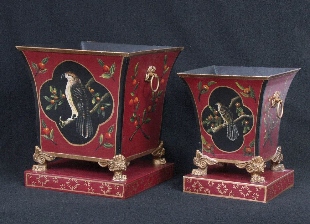 The Alarice Table Vase Set is a beautifully crafted metal duo featuring an antique red and black finish with hand-painted hawk and fruit motifs. Versatile use option, it can be used to display floral arrangements or as standalone decorative accents, with two different sizes included, you can create a layered display in any setting.Features:Overall product dimensions are 8.5" W x 8.5" D x 10.5" HSturdy metal construction for lasting strength and stabilityCan hold fresh flowers, dried arrangements, or faux greeneryFunctional side handles for easy carryingSet of two - includes both large and small vases for a layered lookDimensions:Vases, Urns, Jars, and BottleAssembled Product: 8.5 inches wide x 8.5 inches deep x 10.5 inches high.