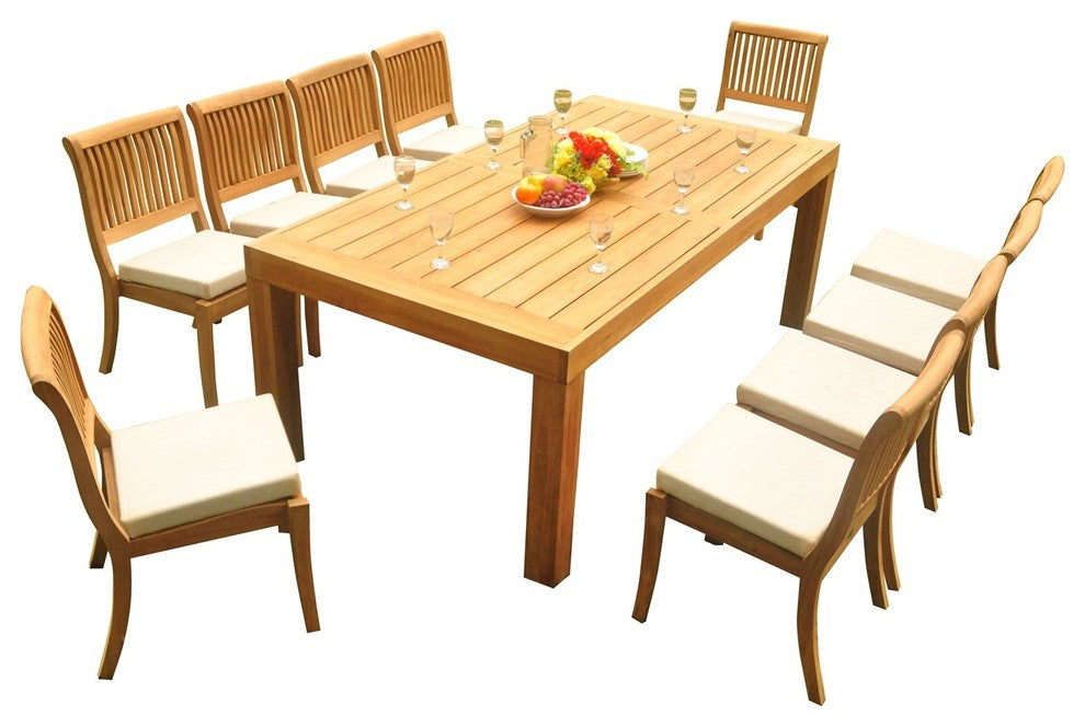 Set includes: 86" Canberra Rectangle Fixed Dining Table and 10 Stacking Armless Chairs.The chairs will stack for convenient storage in limited spaces.Dining Table features wide-plank geometric angles and clean lines smooth sanded teak.Unique 4" thick legs provide clean composition in a contemporary profile with modern flair.There is a 2" hole for umbrella in middle of table, lid (wooden cap) provided to cover hole when umbrella not in use.Stainless steel is also used to complement the beauty of teak in the construction of our furniture.All critical connections are made in the traditional mortise-and-tenon joinery with the strictest tolerances. We use only select kiln-dried teakwood.Sunbrella Fabric Cushions are sold separately.Assembly: Chairs comes fully assembled. Table requires very little assembly (Hardware and instructions included). Assembly is quick and simple.Please search Houzz for our tailor made, high quality cushions for this furniture set by looking for "Sunbrella Fabric Outdoor Cushion" in the Houzz search tool!Table Dimension: 86" Length x 43" Width x 30" Height, 2" Umbrella Hole is in the center of the tableStacking Armless Chair Dimension: 18.5" Width x 19" Depth x 34.5" Height; Seat Dimensions: 17" Width x 17" Depth