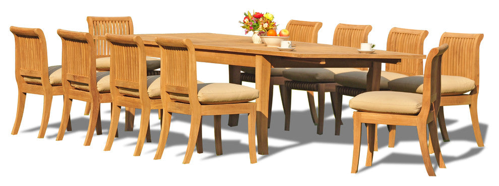 Choose your Sunbrella fabric color from the swatch shown in 2nd picture.Set includes: Sunbrella Fabric Dining Cushions for 10 Chairs & 122" Double Extension Rectangle Dining Table and 10 Armless Chairs.With a unique dual butterfly extension leaf system integrated into the table, one or both of the butterfly leaves can be collapsed or extended at any time.There is a 2" hole for umbrella in middle of table, lid (wooden cap) provided to cover hole when umbrella not in use.Stainless steel is also used to complement the beauty of teak in the construction of our furniture.All critical connections are made in the traditional mortise-and-tenon joinery with the strictest tolerances. We use only select kiln-dried teakwood.Cushions Thickness is 2.5". All the Cushions comes with a zipper in the back side and ties for easy removal when needed.Assembly: Very little assembly is required (Hardware & Instructions included). Assembly is quick and simple.Please search Houzz for our tailor made, high quality cushions for this furniture set by looking for "Sunbrella Fabric Outdoor Cushion" in the Houzz search tool!Table Dimension: 83" Length (Closed position), 102.5" (Single leaf extended out) and 122" Length (Both leaves extended out), 43" Width, 31" Height, 2" Umbrella Hole is in the center of the tableArmless Chair Dimension: 19.5" Width x 22" Depth x 34.5" Height; Seat Dimensions: 19.5" Width x 18" Depth