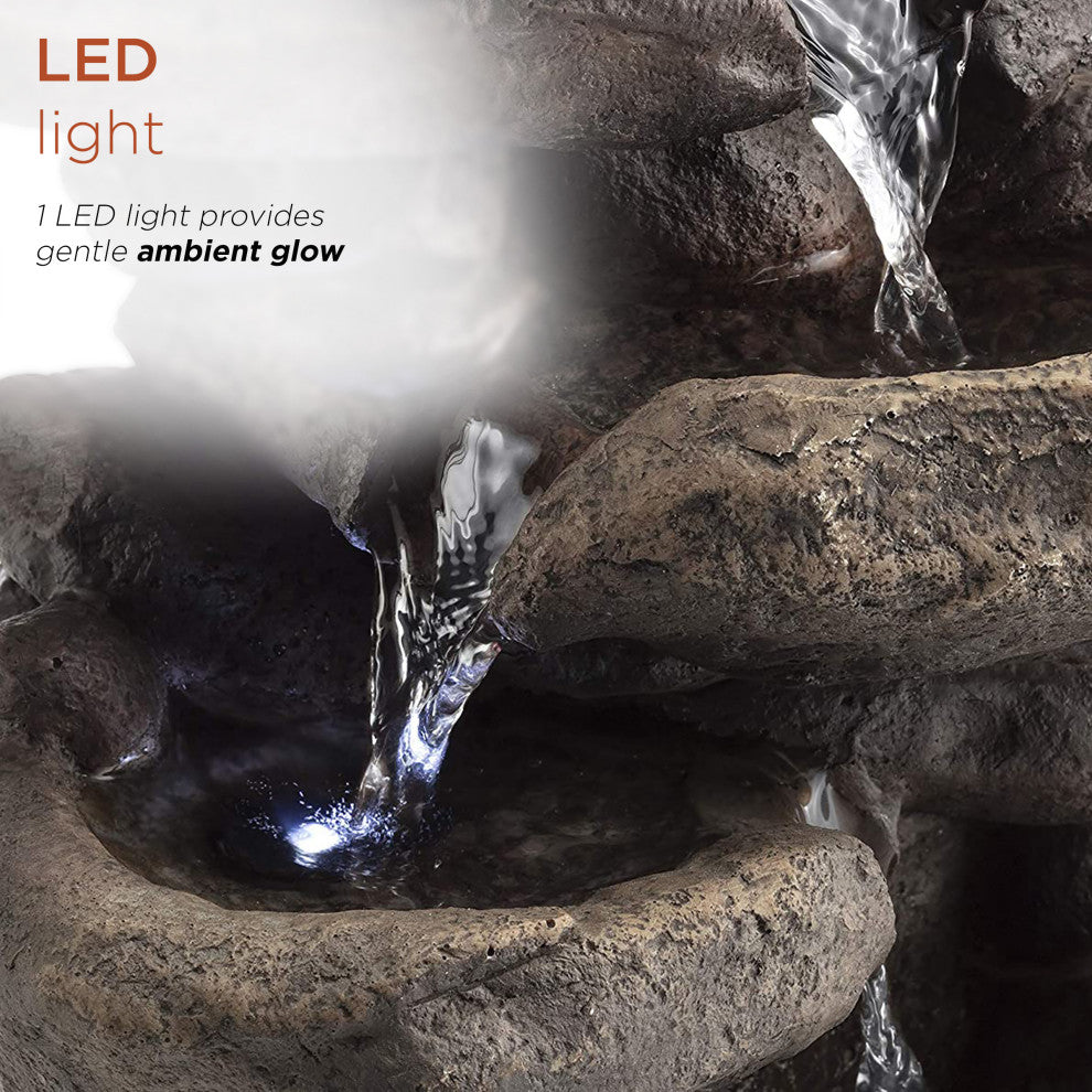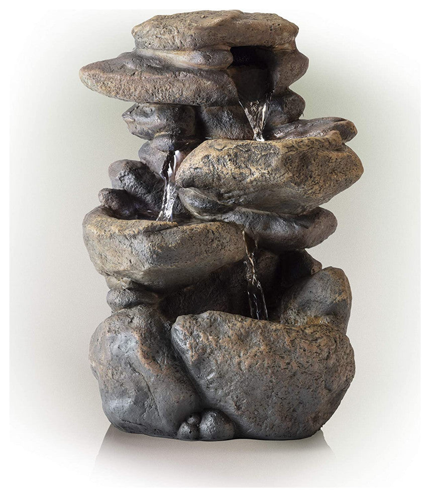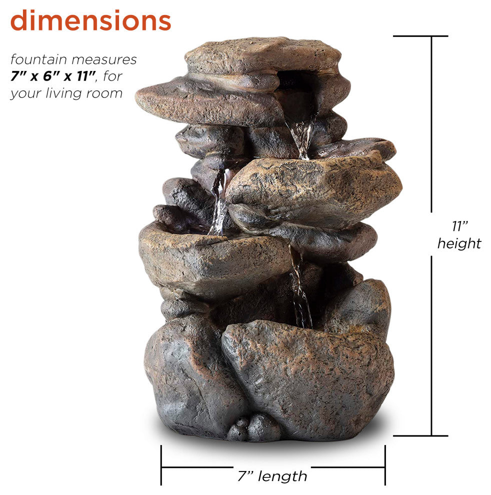 Unplug from the day and meditate to the sound of flowing water with the Alpine Corporation 11" Tall Indoor 3-Tier Tabletop Stone Water Fountain. This modern Zen tabletop-style fountain statue provides a tranquil and soothing addition to your porch or patio. Constructed from durable resin, stone powder, and fiberglass, the fountain is weatherproof, rust-resistant, and resilient and can be used in your home''s interior decor or outside. This unique and versatile decor piece will provide a tranquil and soothing addition to your home''s backyard or indoor decor. Evoking a traditional Zen garden, the fountain has a natural aged stone appearance that becomes illuminated with the LED lights. Relax to the sounds of the calming natural water flow as it trickles down from the top tier of the fountain. Not only will the fountain provide you with a sense of serenity, it will also attract birds to your outdoor area, which in turn promotes healthy gardens. This updated take on the classic fountain is an elegant addition to your courtyard, patio, or yard, and gives your garden or tabletop visual interest with its natural waterfall style. For quick install and convenient operating, the fountain includes all necessary parts to begin creating an outdoor oasis. This fountain measures 7"L x 6"W x 11"H to fit almost any indoor or outdoor table space and includes a one-year manufacturer''s warranty from date of purchase. VERSATILE HOME DECOR: Rainforest cascading tabletop water fountain statue with natural aged stone look will provide a tranquil and soothing addition to your indoor living space DURABLE TABLETOP DECOR: Constructed from durable resin, stone powder, and fiberglass, the fountain is weatherproof, rust-resistant, and resilient, and is perfect for decorating your home office NATURAL TRANQUILITY: Relax to the sounds of the calming natural water flow as it trickles down from the top tier of the fountain, while adding visual interest to your outdoor conversation set or table ALL PARTS INCLUDED: For quick install and convenient operating, the waterfall fountain includes all necessary parts to begin creating an outdoor oasis TABLETOP FOUNTAIN AND 1-YEAR WARRANTY: Measures 7"L x 6"W x 11"H to fit almost any outdoor or indoor area, and includes a one-year manufacturer''s warranty from date of purchase