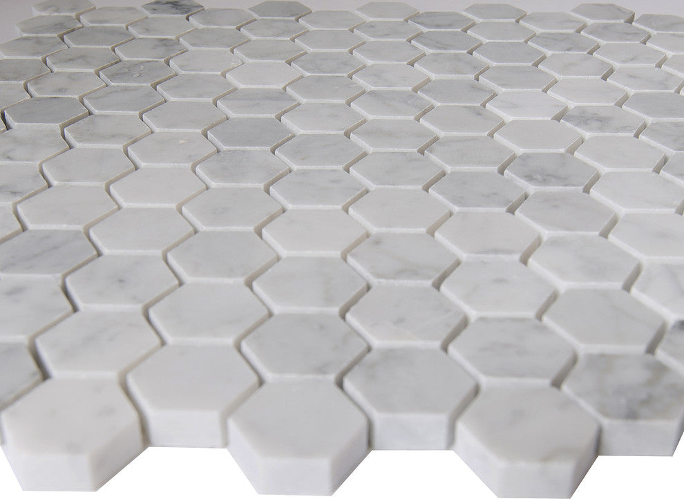Specifications:General Name: Carrara White Marble Mosaic TileCollection: Carrara White MarbleName: CWMSKU: CWMM1HEx-HType: Mosaic Tile Size: 11-1/2"x11"x3/8"Chip Size: 1" HexagonFinish: HonedApplication: Wall and Floor