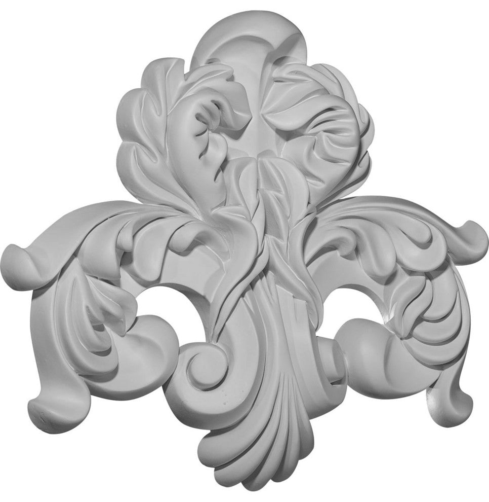 12 1/2"W x 10 5/8"H x 1 1/2"P Benson Center Flourish Onlay. Our appliques and onlays are the perfect accent pieces to cabinetry, furniture, fireplace mantels, ceilings, and more. Each pattern is carefully crafted after traditional and historical designs. Each polyurethane piece is easily installed, just like wood pieces, with simple glues and finish nails. Another benefit of polyurethane is it will not rot or crack, and is impervious to insect manifestations. It comes to you factory primed and ready for your paint, faux finish, gel stain, marbleizing and more.