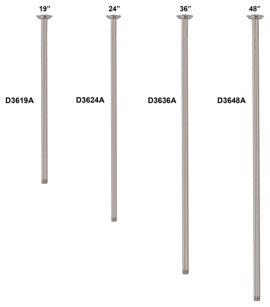 Use this plated, solid brass, 1/2 in. IPS, ceiling mounted shower arm, for long projection, ceiling mounted rain shower heads of all diameters. 19 in. long. Decorative, machined brass flange included. 1/2 in. x 19 in. ceiling arm and D3800 Heavy Duty Flange. Lead Free Brass Nipple.