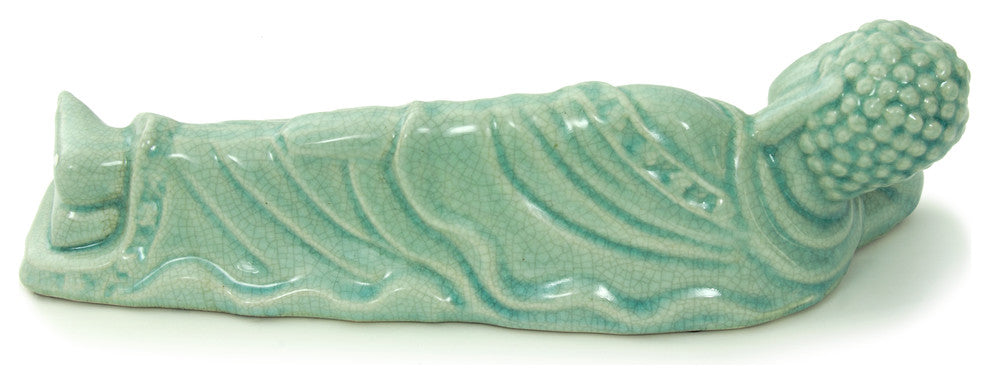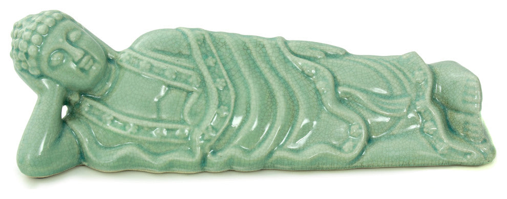 A stunning 12" long reclining Buddha statue resting in sublime repose. With a convenient shape for a long table, shelf, or hearth, if this statue catches your eye, it shouldn''t be too hard to find a great spot for it, home or office.A substantial, foot long decorative accessoryCrafted from top quality ceramicBeautiful crackle glazed finishSublime face and beautifully detailed garments