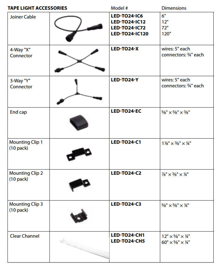 Connectors and accessories for WAC Lighting InvisiLED RGB Color Changing Tape Light system.