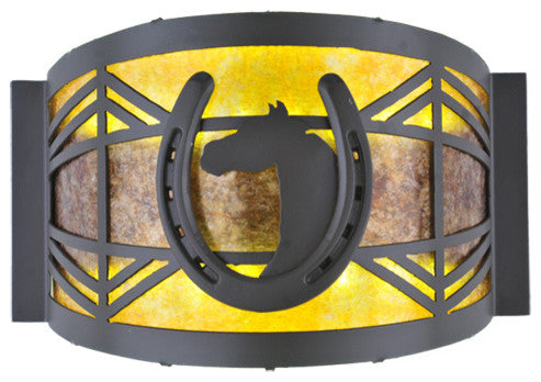 A horse portrait framed in a lucky horseshoe, isdepicted on this handsome wall sconce. The fixture hasamber mica framed in antique copper, and is handcraftedin the usa by meyda artisans bulb type: led bulb quantity: 16 bulb wattage: