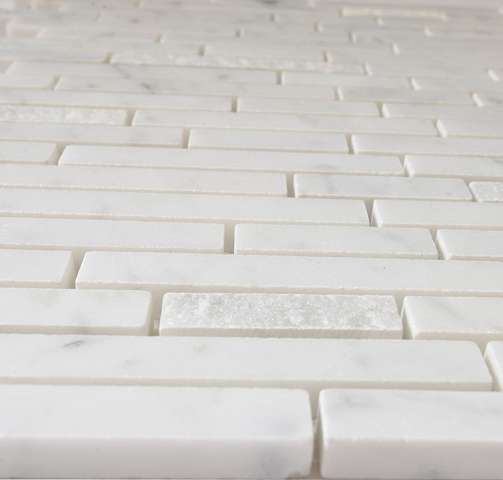 Specifications:General Name: Marble Mosaic TileCollection: TibetName: Carrara WhiteSKU: MM 5101Type: Mosaic Tile Size: 12"x12"Chip Size: 1/2"x2", 1/2"x4" StripsFinish: Polished and Split FaceApplication: Wall