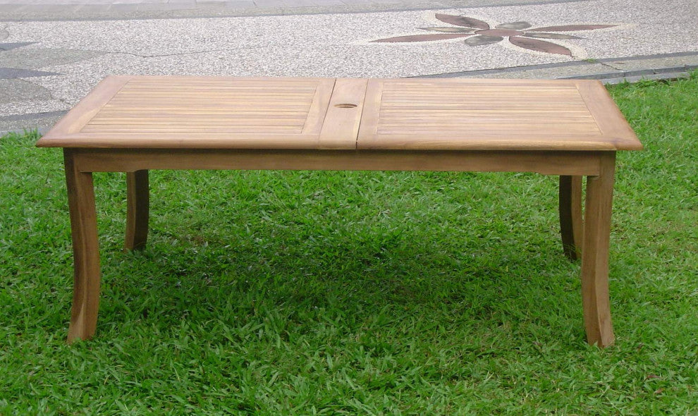 Set includes: 117" Double Extension Rectangle Dining Table and 12 Stacking Arm Chairs.The chairs will stack for convenient storage in limited spaces.With a unique dual butterfly extension leaf system integrated into the table, one or both of the butterfly leaves can be collapsed or extended at any time.There is a 2" hole for umbrella in middle of table, lid (wooden cap) provided to cover hole when umbrella not in use.Stainless steel is also used to complement the beauty of teak in the construction of our furniture.All critical connections are made in the traditional mortise-and-tenon joinery with the strictest tolerances. We use only select kiln-dried teakwood.Sunbrella Fabric Cushions are sold separately.Assembly: Chairs comes fully assembled. Table requires very little assembly (Hardware and instructions included). Assembly is quick and simple.Please search Houzz for our tailor made, high quality cushions for this furniture set by looking for "Sunbrella Fabric Outdoor Cushion" in the Houzz search tool!Table Dimension: 79" Length (Closed position), 98" Length (Single leaf extended out) and 117" Length (Both leaves extended out), 43" Width, 31" HeightStacking Arm Chair Dimension: 23.25" Width x 22" Depth x 34.75" Height; Seat Dimensions: 17" Width x 17" Depth