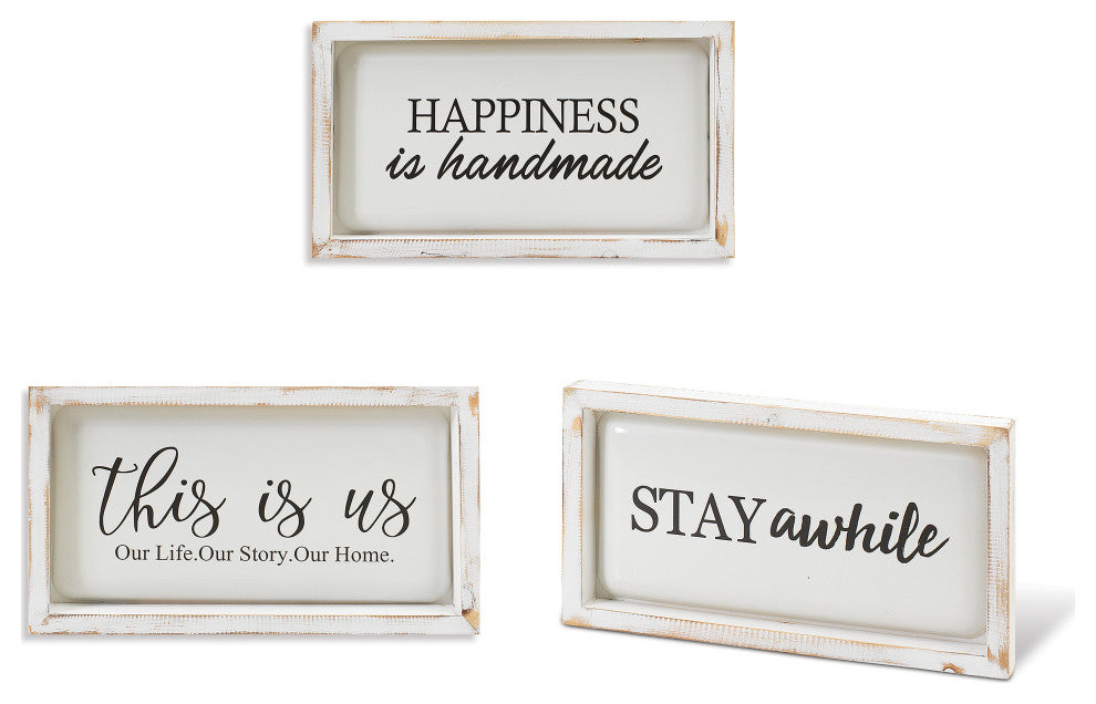 This artfully designed and trendy wall hanging set is just what you need to accent your own decorative style. These stylish wall hangings are made of real wood frames and stamped metal in exquisite detail. The background is a creamy white, with a scrolling message, one is "Happiness is Homemade", "This is US Our Life.Our Story. Our Home" and "Stay AWhile". With it''s 3-dimensional effect it is both modern and artful, each one is framed and ready to hang together for a touch of love and family in your home decor.