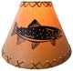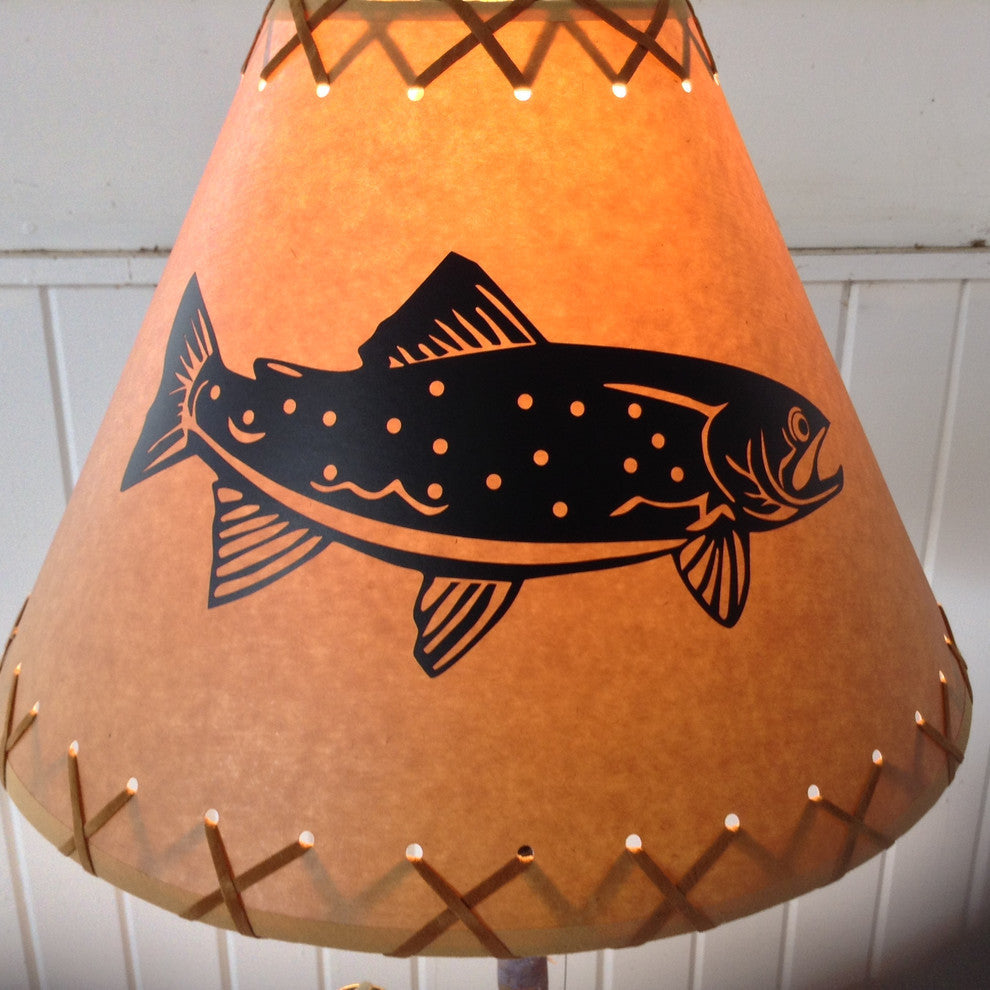 Faux oil kraft laced lamp shade with lacing top and bottomThis rustic shade measures:5"(top)14"(bottom)10"(slant)This shade has standard brass-plated spider wire across the top that works with harp(lamp bracket) and finialNo bulbs included60 watt maxLEDOne bulb requiredUL listingSockets UL File E-136278Cords AU 703482Factory ID L114949G13