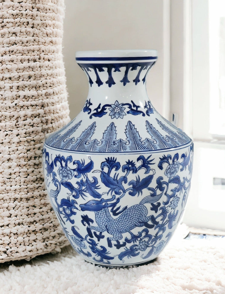 The 14" Porcelain Vase with Floral Design adds a touch of elegance to any space. Made from durable porcelain, this sturdy 8-pound vase ensures lasting quality and appeal. Its detailed floral design enhances any decor, making it perfect for displaying flowers or standing alone as a decorative piece.Features:Overall product dimensions are 11" W x 11" D x 14" HSuitable for displaying fresh flowers, dried arrangements, or decorative branchesHigh-quality porcelain construction ensures lasting durability and useSimple to wipe clean, keeping it looking pristine effortlesslyAvailable in blue and red color variationsDimensions:Vases, Urns, Jars, and BottleAssembled Product: 11 inches wide x 11 inches deep x 14 inches highWeight Capacity: 5 poundsDiameter: 11 inches