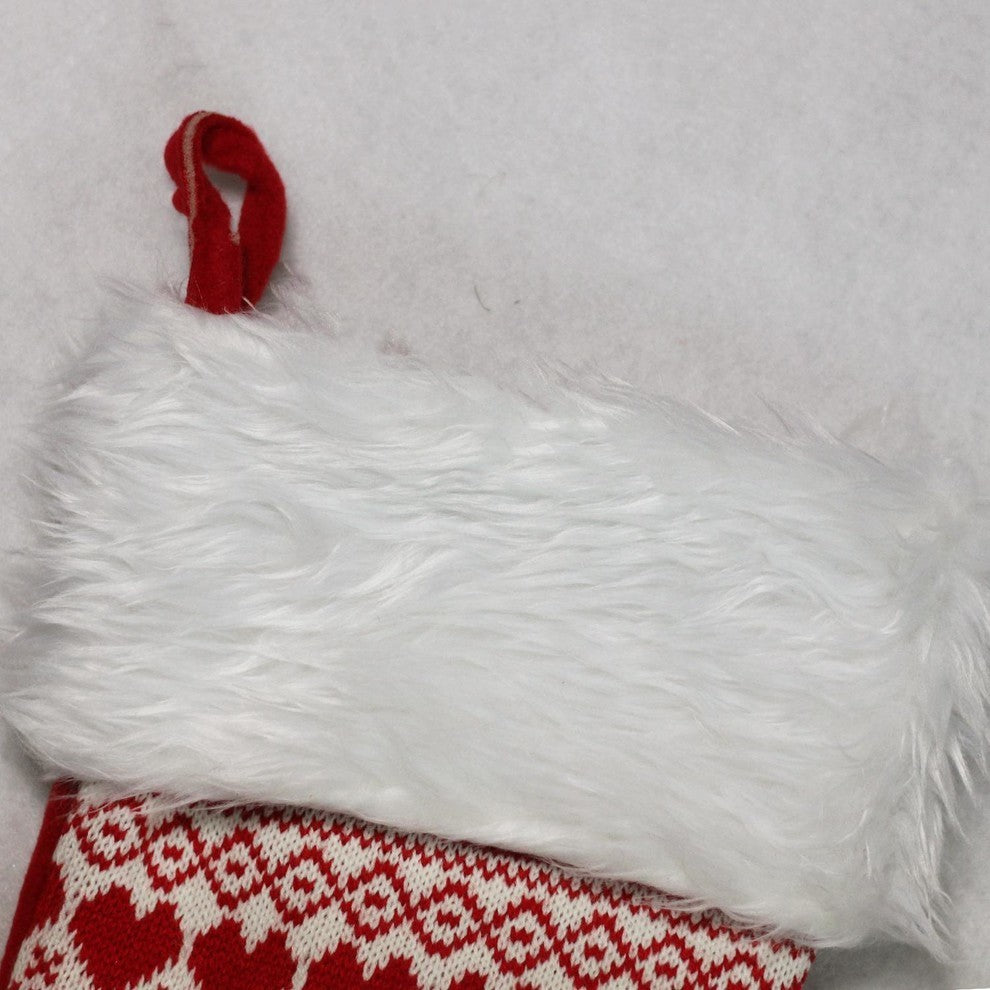 Decorate your house for Christmas with this charming stockingNordic-style knit design with hearts and snowflakesCuff features white faux furComes ready-to-hang on a red fabric loopCare instructions: Spot clean onlyDimensions: 15"H x 10"WMaterial(s): Polyester
