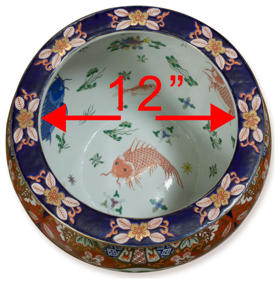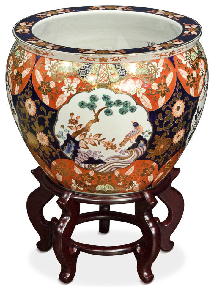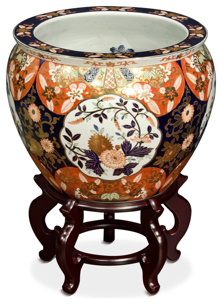 The noble families of ancient China used large bowls such as ours to protect their pond gold fish from the freezing cold of winter. Used today as a cachepot, it gives a large plant a highly decorative place to put down roots. Hand painted floral tapestry motif in blue and orange. Features bird and pine motif in the front, and chrysanthemum flowers on the back. Imported from China. Top opening diameter is approximately 13" dia. Stand sold separately.Painted by hand. For indoor use only