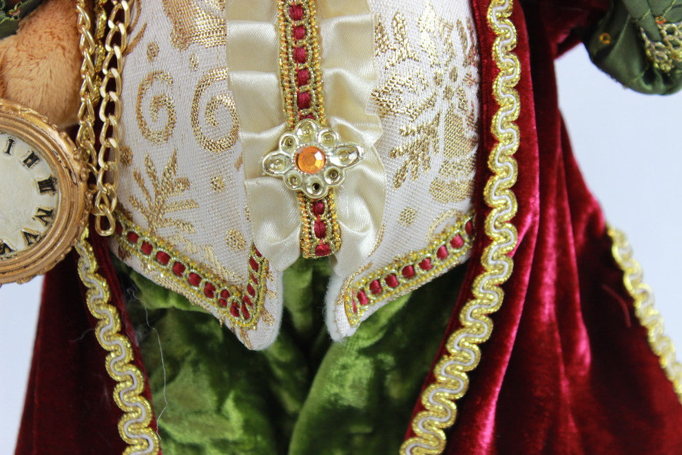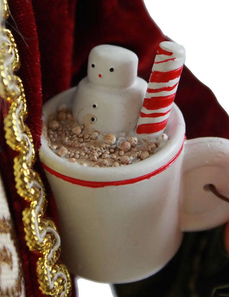 This Ethnic Santa is ready to spread the cheer by sharing a sip of his hot cocoa with mini white marshmallows (and a face) and a red and white striped peppermint stick. His buttery soft beard and mustache and rimless glasses accent his huge Santa. Father Christmas has brought an antique pocket watch to countdown to Christmas Day, and He''s staying warm and cozy with his brown teddy bear trimmed with a red, green, and gold ribbon. He''s wearing a gorgeous dark burgundy jacket with gold squiggle trim for fun and fancy. And his green shirt and lapels have more gold trim, and a tiny square pattern with gold sequins. His vest adds to the whimsy with curly Q''s, floral, and polka dots, and it''s all tied together with gold and amber buttons. His solid polyresin boots enable him to stand firmly on any flat surface and his hat has a hidden wire to adjust to any configuration. He is elegance and holiday spirit in one glance.