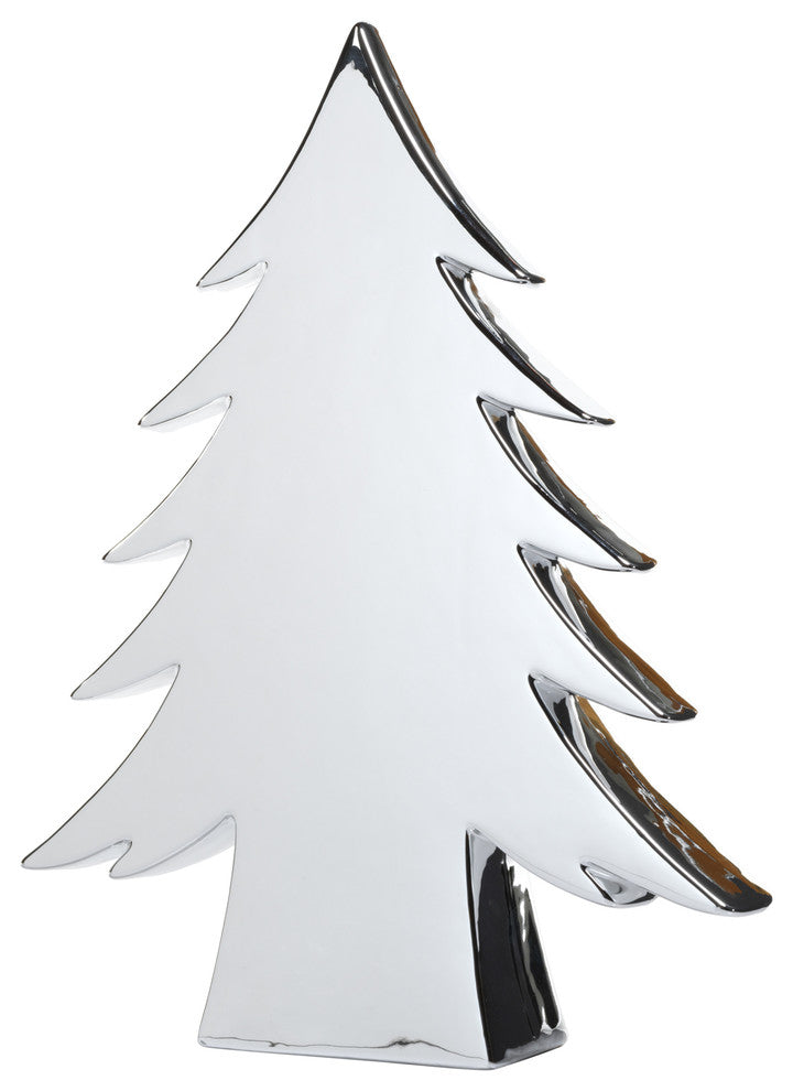 These beautiful ceramic stemmed trees will bring a fresh and festive look to your tabletop, shelf, or mantel. Durable and classic, this decor is the perfect choice for any existing holiday theme. Tabletop Christmas treeStunning in a sleek silver plated finishFeatures a contemporary spin on the traditional tabletop Christmas treeMade of ceramicMeasures 13"L x 2.75"W x 16.5"H
