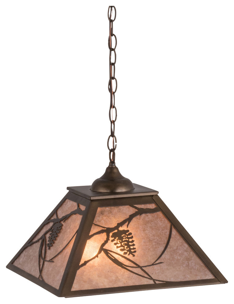 Listen closely. You can almost hear the soft whisper of the pine branches as they dance in the wind. Enjoy the warm ambiance of the soft beautiful light diffused through Silver Mica which features stunning pinecone and pine branch motifs The fixture is hand finished in a handsome Antique Copper and handcrafted by Meyda Artisans in Yorkville, New York, at the foothills of the inspiring Adirondack Mountains. Custom sizes, styles, colors and dimmable energy efficient lamping options are available.