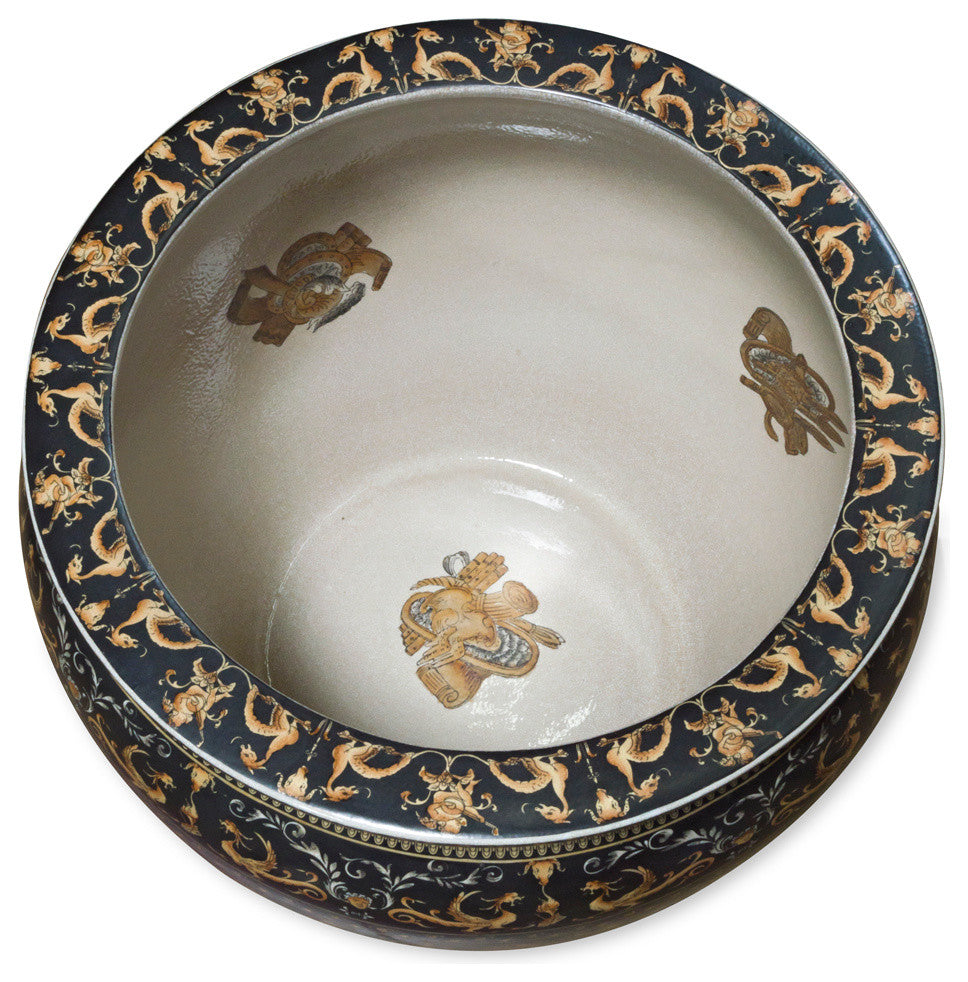 The noble families of ancient China used large bowls such as ours to protect their pond gold fish from the freezing cold of winter. Used today as a cachepot, it gives a large plant a highly decorative place to put down roots. Beautifully hand painted in Renaissance Tapestry Design. Imported from China. Top opening diameter is approximately 13" dia. Stand included.Painted by hand. For indoor use only