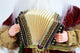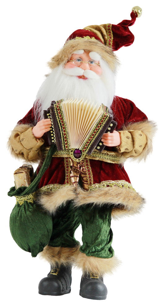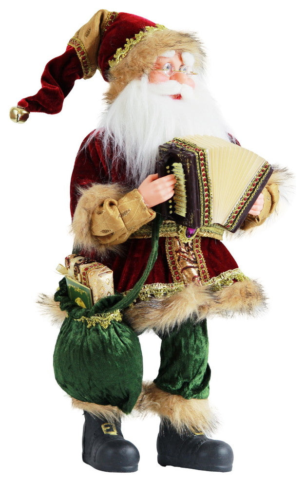 He moves! His head sways to Christmas tunes as he opens & closes his accordion to an entire litany of 8 short classic Christmas tunes. His deep burgundy coat, gold trim, and gold bells on his hat spread Christmas cheer and music wherever he goes. He is carrying a dark green toy bag laced with gold trim and loaded with wrapped presents and a miniature book. He stands firmly on any flat surface as he dances and plays his accordion into the Christmas night. His wonderfully soft beard and mustache add warmth and charm and match his rimless glasses and jovial expression, and his hat has a hidden wire to adjust to any configuration. There is no more jovial cheerful Santa than this delightful accordion dancing Santa. He plays; "Jingle Bells", "We Wish You A Merry Christmas", "Silent Night", "Deck the Halls", "Joy to the World", "The First Noel", "Hark the Herald Angels Sing", and "O'' Christmas Tree" (O'' Tannenbaum). There is an on/off switch, and requires 3 AA batteries not included. His outstanding accordion songs are guaranteed to bring a smile to your holiday season.