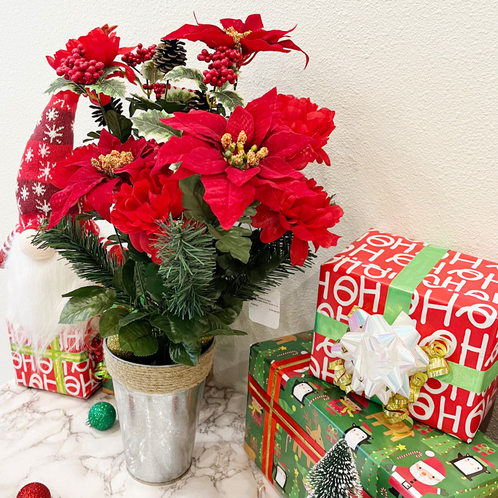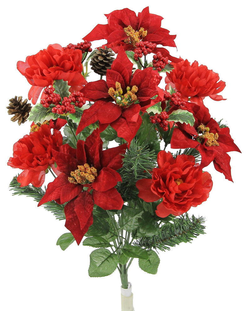 This 18 stems artificial mix flower bush combined with faux peony, red velvet poinsettia, PVC pine and pinecone, holy leaves and red berries and with the backdrop of lush greenery. Suitable for Christmas holiday home decorating, floral arrangement, table centerpiece arrangement with your favor vase, Christmas memorial and any special events. Size 22"H x 14"W x 7"D. It can also be a gift to family and friends or neighbors. Product may ship compressed. Dimensions based on image shown. Primping required to match the image shown.