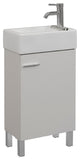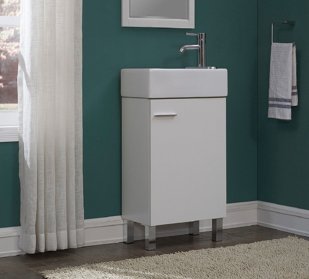 This combo mini vanity features a sleek white finish and one door design. Unit measures 18" wide, 11" deep and 34" high for convenient storage. Two installation options; wall hang or legs. RunFine.Faucet not included.