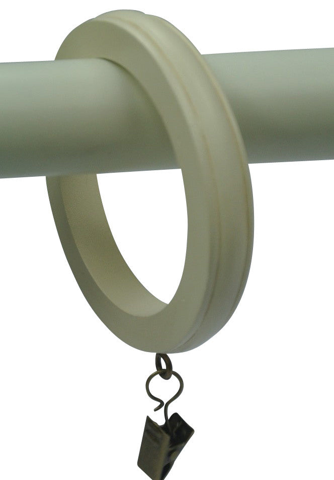 Curtain rings are a necessity, but that doesn''t mean that they have to be boring. These designer curtain rings have clips to attach to drapery panels and are made of polyresin. The ring has an inner diameter of 2 1/2"and an outer diameter of 3 1/2". The maximum recommended curtain rod size for this ring is 2". Available in 4 finishes: burnt gold, renaissance gold, pewter, and ivory.
