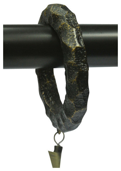 Curtain rings are a necessity, but that doesn''t mean that they have to be boring. These designer curtain rings have clips to attach to drapery panels and are made of polyresin. The ring has an inner diameter of 2 1/2"and an outer diameter of 3 3/4". The maximum recommended curtain rod size for this ring is 2". Available in 3 finishes: burnt gold, renaissance gold, and antique silver. The hammered texture is found on the entire ring.