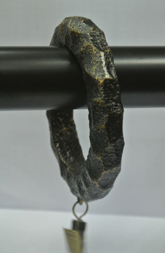 Curtain rings are a necessity, but that doesn''t mean that they have to be boring. These designer curtain rings have clips to attach to drapery panels and are made of polyresin. The ring has an inner diameter of 2 1/2"and an outer diameter of 3 3/4". The maximum recommended curtain rod size for this ring is 2". Available in 3 finishes: burnt gold, renaissance gold, and antique silver. The hammered texture is found on the entire ring.