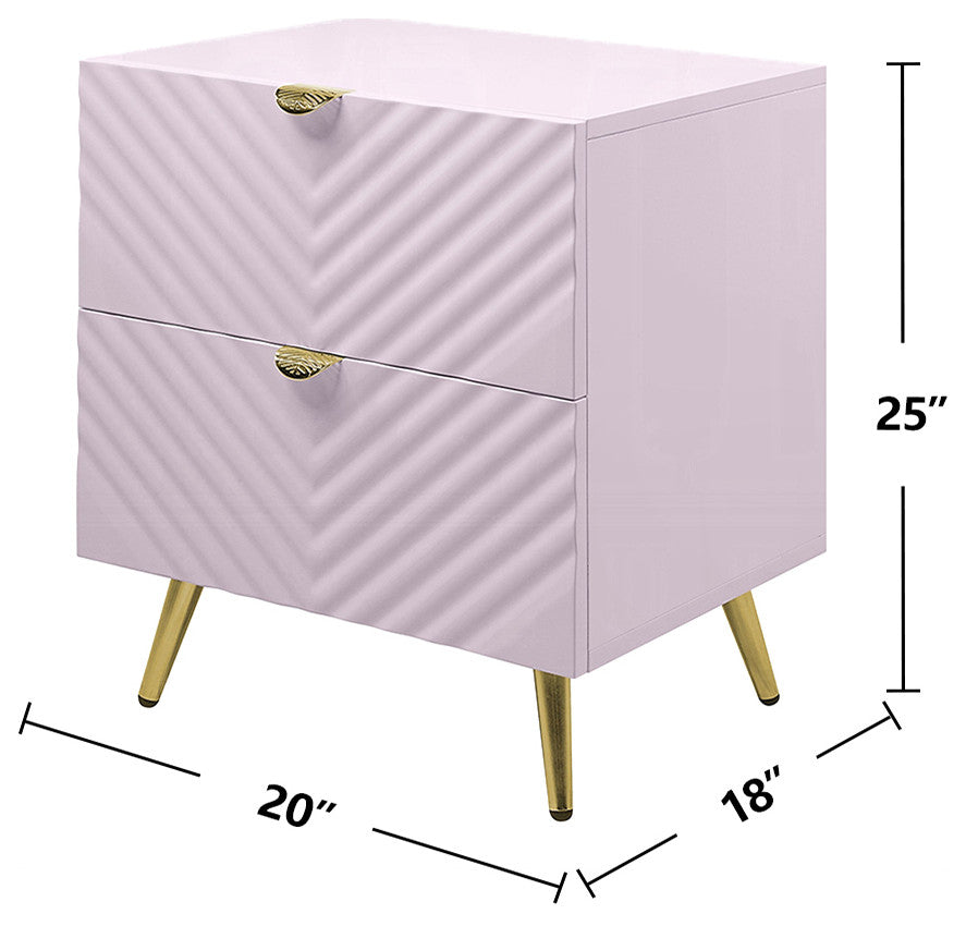 The nightstand is a glamorous and sophisticated that adds a chic style to any room. The pink gloss finish and gold metal accents help to accentuate the clean lines of the pieces and add a pop of glamour. The diagonal line design adds visual interest and texture, making each piece stylish. For storage, this item included 2 drawers.