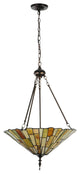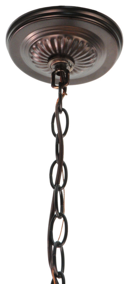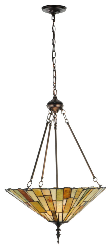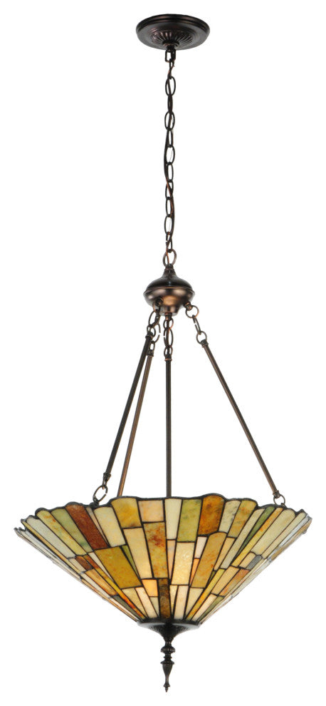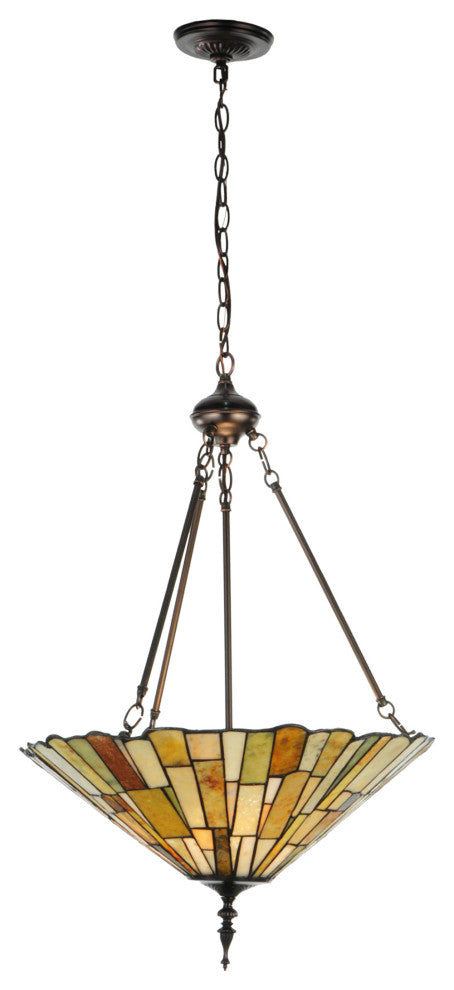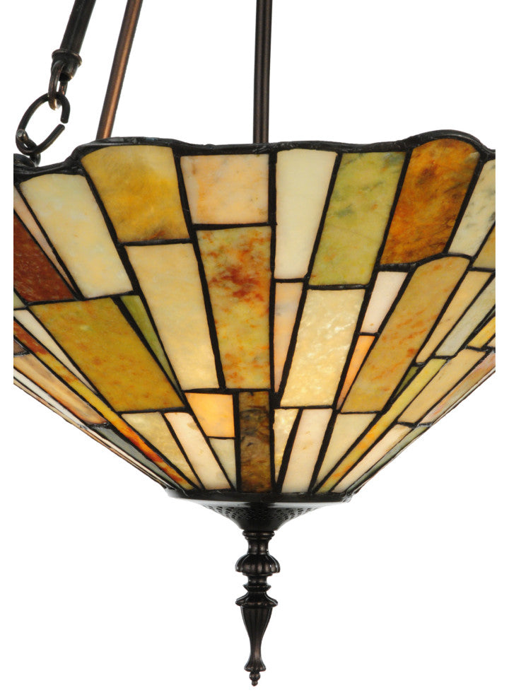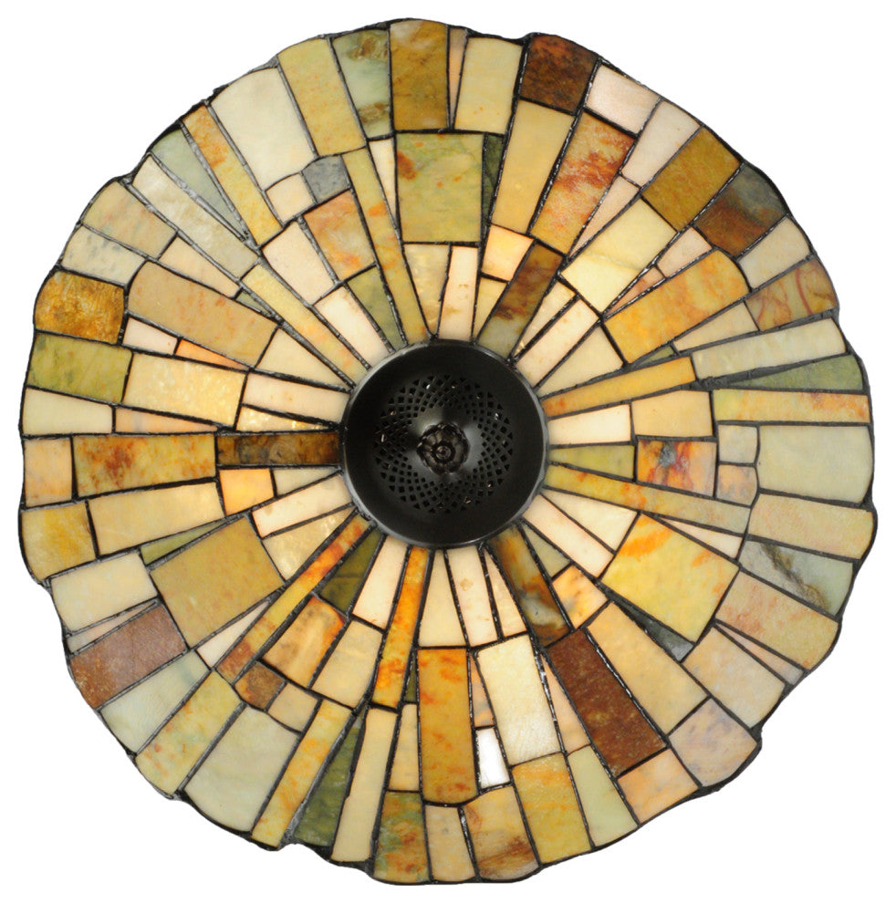 Thinly hand carved and polished natural Jadestone in earthy tones of Moss Green, Tan, Natural Ivory and Coral become luminescent in this unique tile patterned pendant shade and complemented with hardware finished in Mahogany Bronze. The natural stone shade is crafted using the famous copper foil construction process that creates Tiffany stained glass lamps and fixtures.