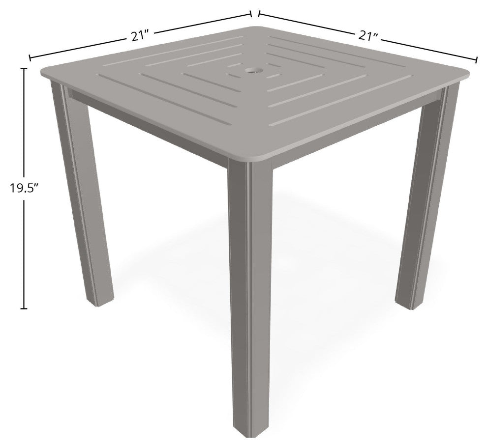 Marine Grade Polymer Top Tables combine modern design with unmatched durability for outdoor living. With options in coffee, chat, dining, accessory, balcony, and bar heights, they offer versatility for any setting. Sleek lines and sharp angles create a clean, contemporary look, while marine-grade polymer surfaces resist cracking, rotting, and water damage. Built to last, these tables are a practical and stylish choice for outdoor spaces.Features:•  Overall product dimensions are 21" W x 21" D x 19.5" H•  Marine-grade polymer resists cracking, rotting, and water damage, inside and out•  Modern dash-pattern table top design•  Durable powder-coated aluminum frame resists rust and ensures long-lasting strength•  High-quality 100% stainless steel hardware•  Low-maintenance and easy to clean•  Available in multiple color variations•  Proudly made in the USA with over a century of craftsmanship since 1903Dimensions:End Table•  Assembled Product: 21 inches wide x 21 inches deep x 19.5 inches high•  Weight Capacity: 350 pounds