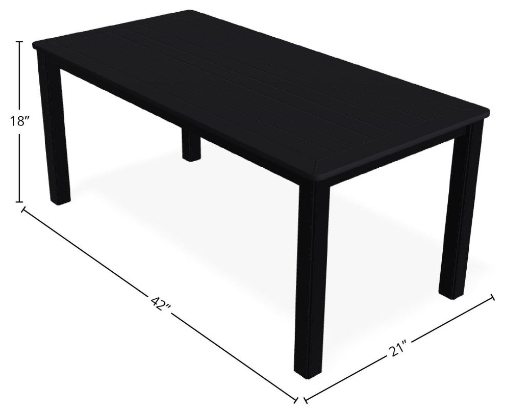 Marine Grade Polymer Top Tables combine modern design with unmatched durability for outdoor living. With options in coffee, chat, dining, accessory, balcony, and bar heights, they offer versatility for any setting. Sleek lines and sharp angles create a clean, contemporary look, while marine-grade polymer surfaces resist cracking, rotting, and water damage. Built to last, these tables are a practical and stylish choice for outdoor spaces.Features:•  Overall product dimensions are 21" W x 42" D x 18" H•  Marine-grade polymer resists cracking, rotting, and water damage, inside and out•  Slat top design ensures durability, water drainage, and a sleek look•  High-quality 100% stainless steel hardware•  Available in multiple color variations•  Proudly made in the USA with over a century of craftsmanship since 1903Dimensions:Coffee Table•  Assembled Product: 21 inches wide x 42 inches deep x 18 inches high•  Weight Capacity: 350 pounds