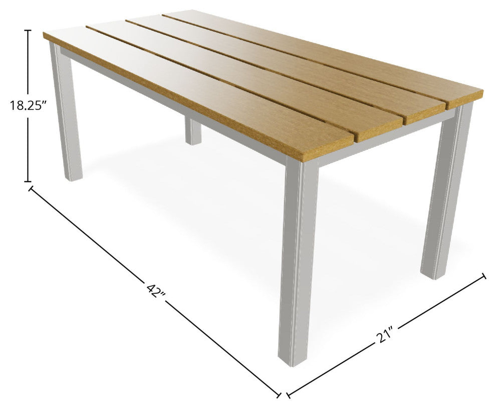 Our Rustic Top Table collection combines timeless design with durable, high-quality materials for your outdoor living space. Crafted with classic wood slat patterns and rich textures, these tables are made from weather-resistant materials designed to withstand the elements. Available in a range of color options, they offer a warm, countryside charm that complements any setting. The collection spans various heights, including coffee, chat, dining, accessory, balcony, and bar, adapting seamlessly to any setting.Features:•  Overall product dimensions are 21" W x 42" D x 18.25" H•  High-quality 100% stainless steel hardware•  Rustic polymer table top features a stylish, textured design•  Low-maintenance and easy to clean•  Available in multiple color variations•  Proudly made in the USA with over a century of craftsmanship since 1903Dimensions:•  •