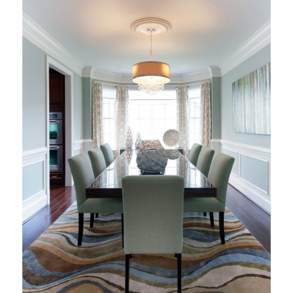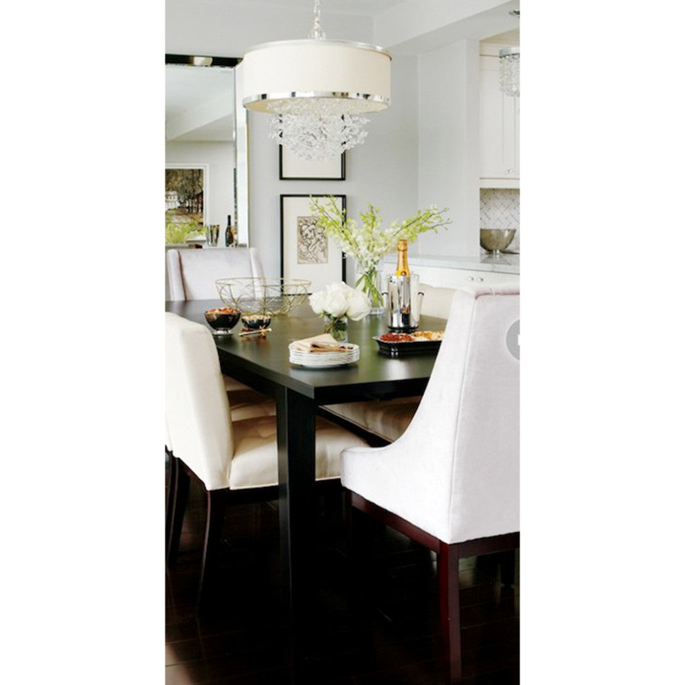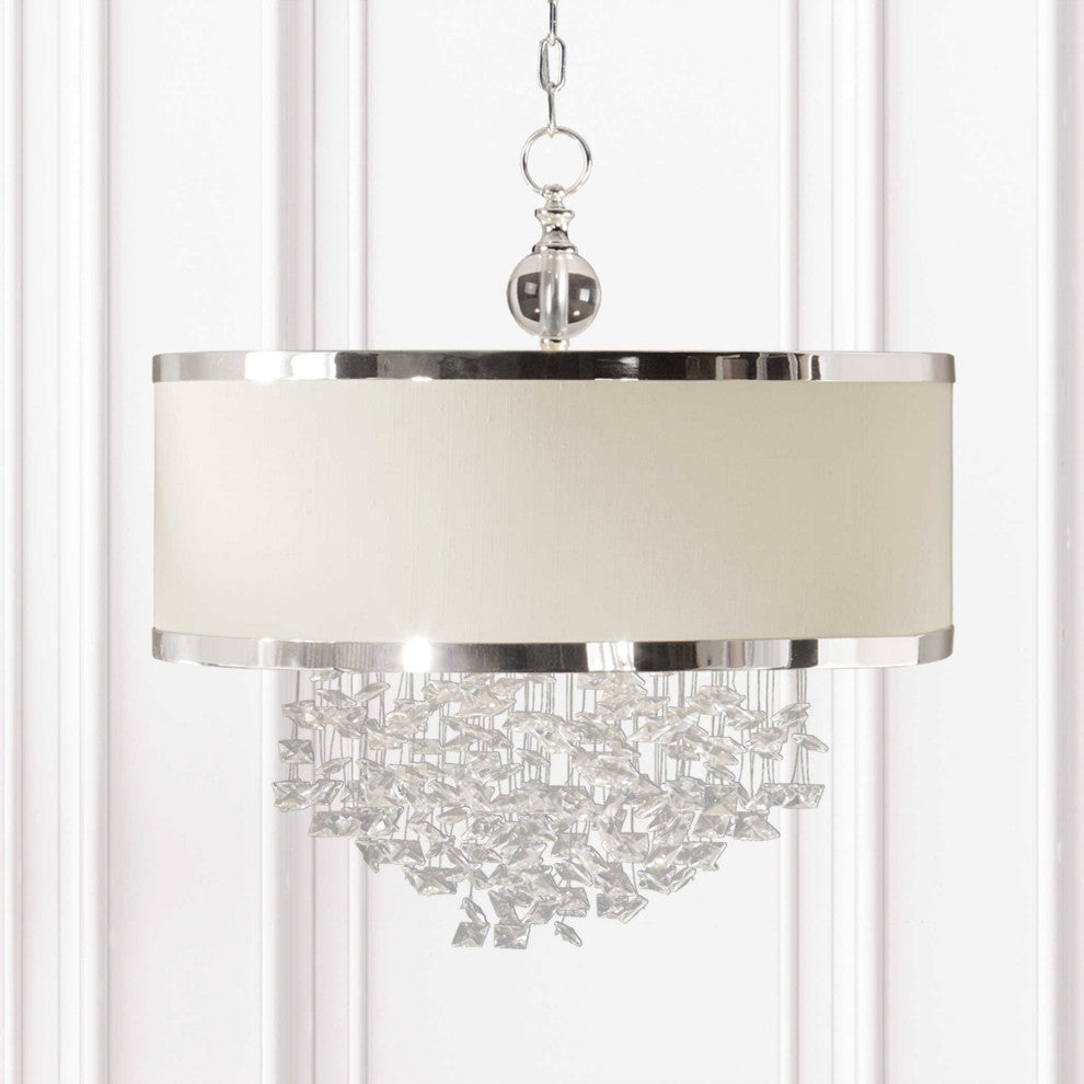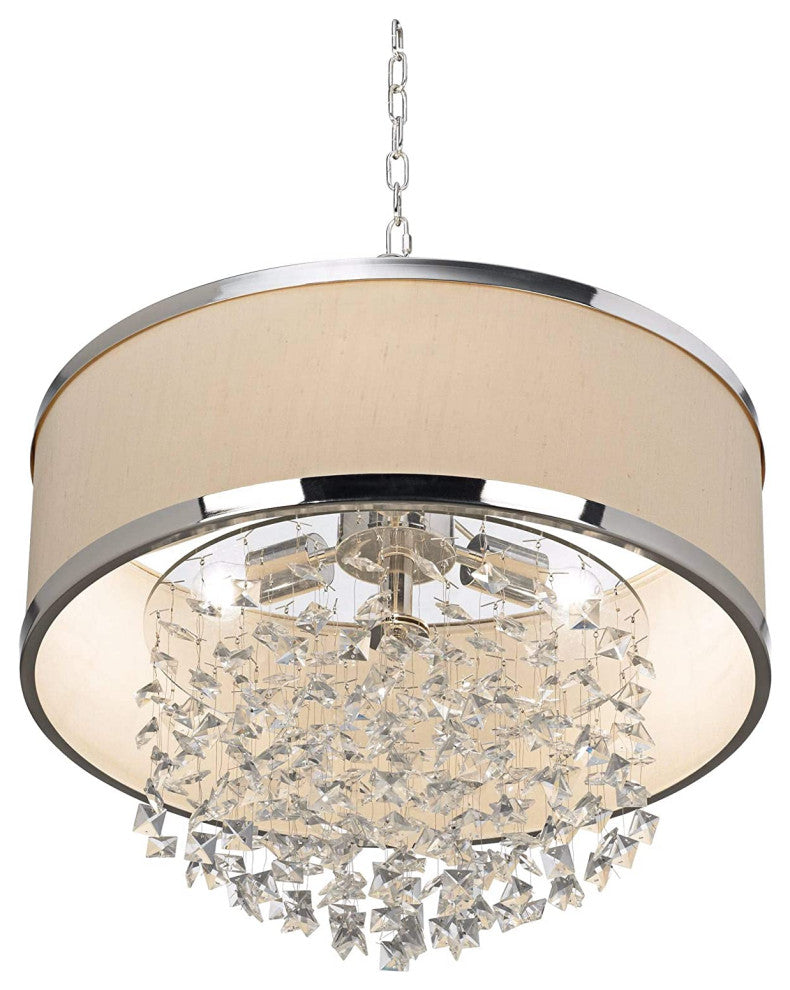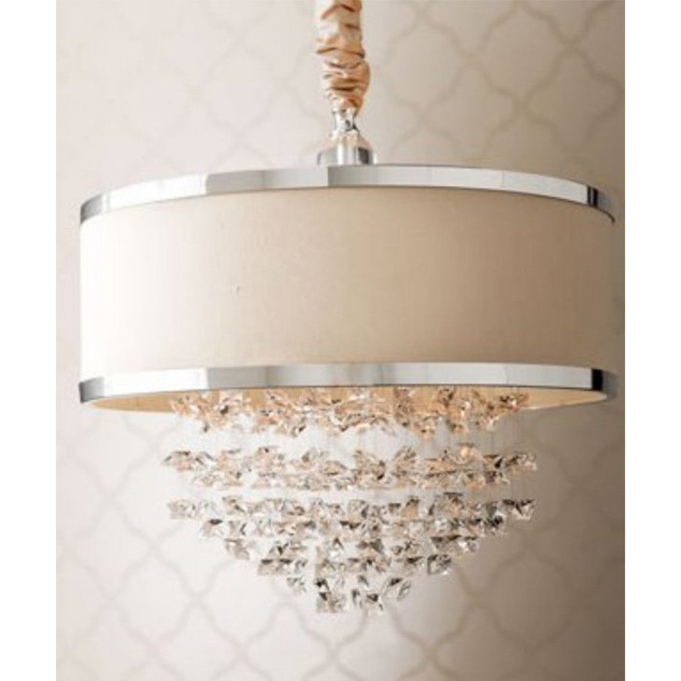 The classic appeal of crystal is updated for today''s sophisticated tastes, with free falling crystals and a silver trimmed, antique- white linen, drum shade.