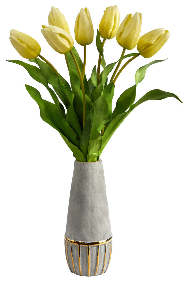 A symbol of spring, you can now enjoy the Tulip''s warmth all year long with this Dutch Tulip Artificial Arrangement. A bunch of Tulip flowers not yet in bloom, are accented by green leaves to bring texture, drama and color to spaces in need of a spring awakening. Experience the fresh from the garden feel every season effortlessly without the need for maintenance. Standing 22" from a stoneware vase with gold trimmings (included in height), gift as a present. Perfect for offices, mantels, kitchens, bedrooms or kitchen nooks. Silk arrangements are manufactured using synthetic materials, such as polyester material or plastic, and are well designed and constructed to be life-like in appearance. This item will need to be re-shaped when removed from the secure box to allow it to reach its fullest size. Your arrangement will look beautiful for years to come; simply wipe clean with a soft dry cloth when needed.About Nearly Natural Inc. - For over 75 years, Nearly Natural Inc. has been providing conscientious consumers with beautiful alternatives to natural decorations. Employing and advised by naturalists who understand the live plant world, Nearly Natural is able to recreate the most realistic-looking decorative items for homes, offices, and businesses. Driven by a true commitment to customer service, attention to detail, and natural philosophy, Nearly Natural strives to bring customers the most beautiful, unique, and striking faux plants and floral on the market.