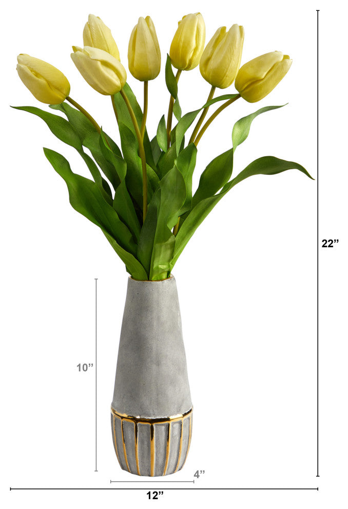 22" Dutch Tulip Artificial Arrangement, Stoneware Vase With Gold Trimming