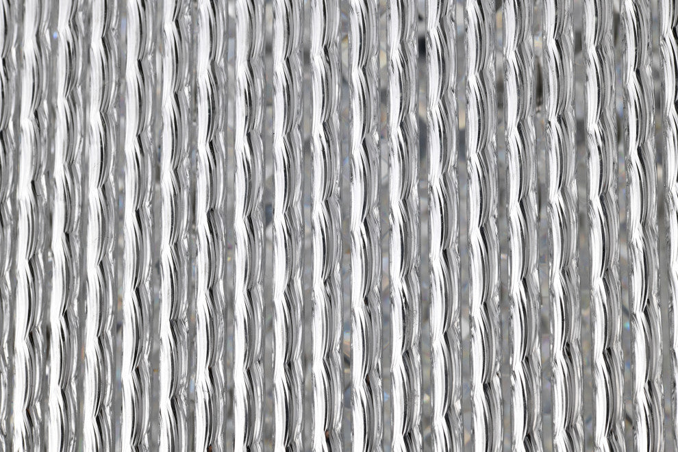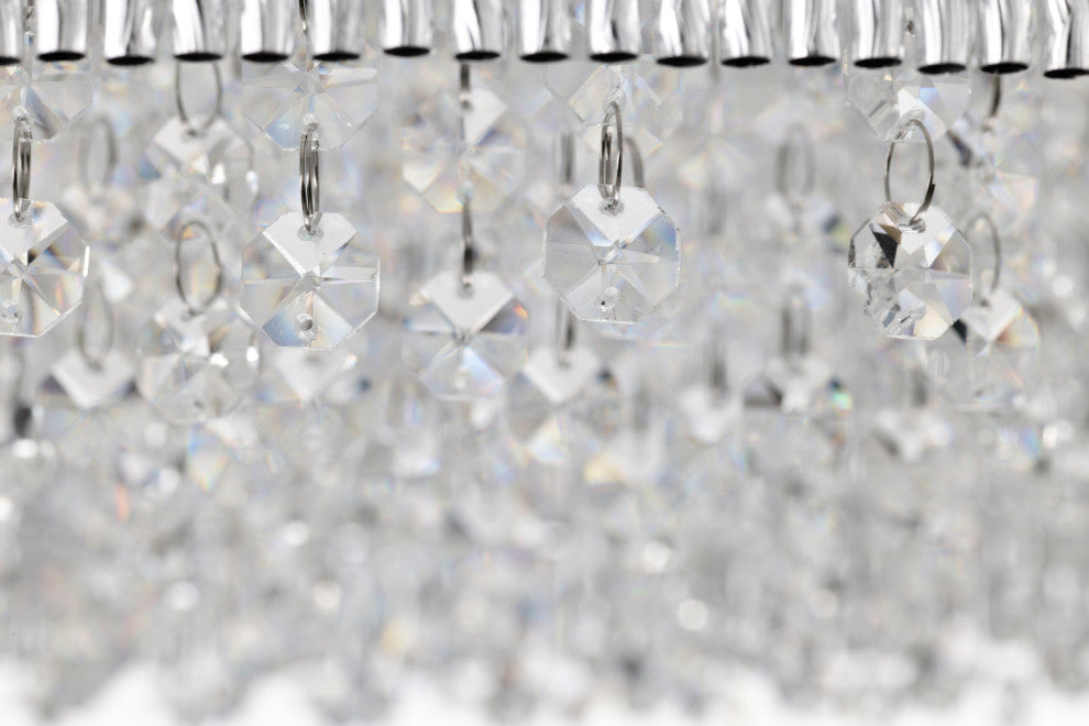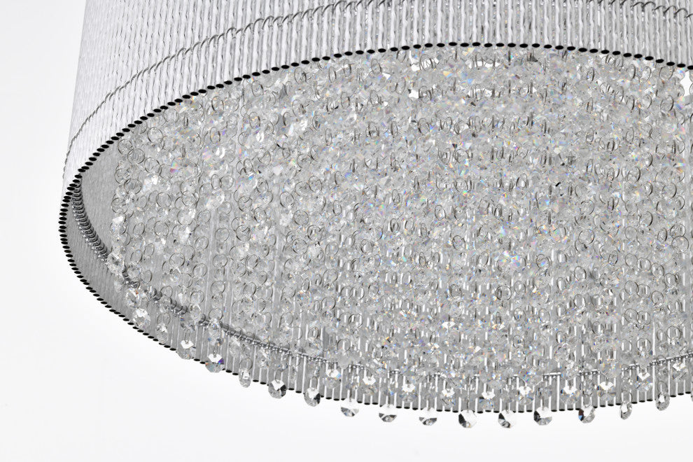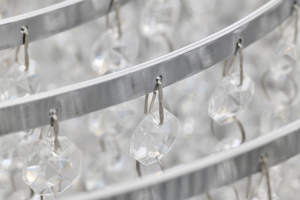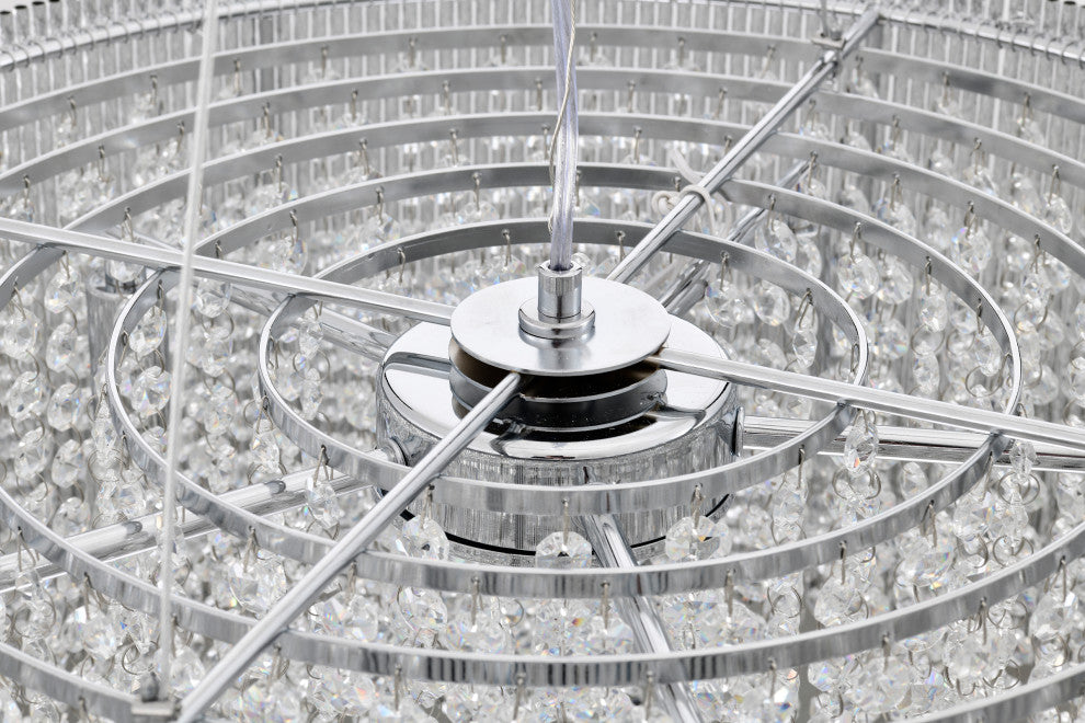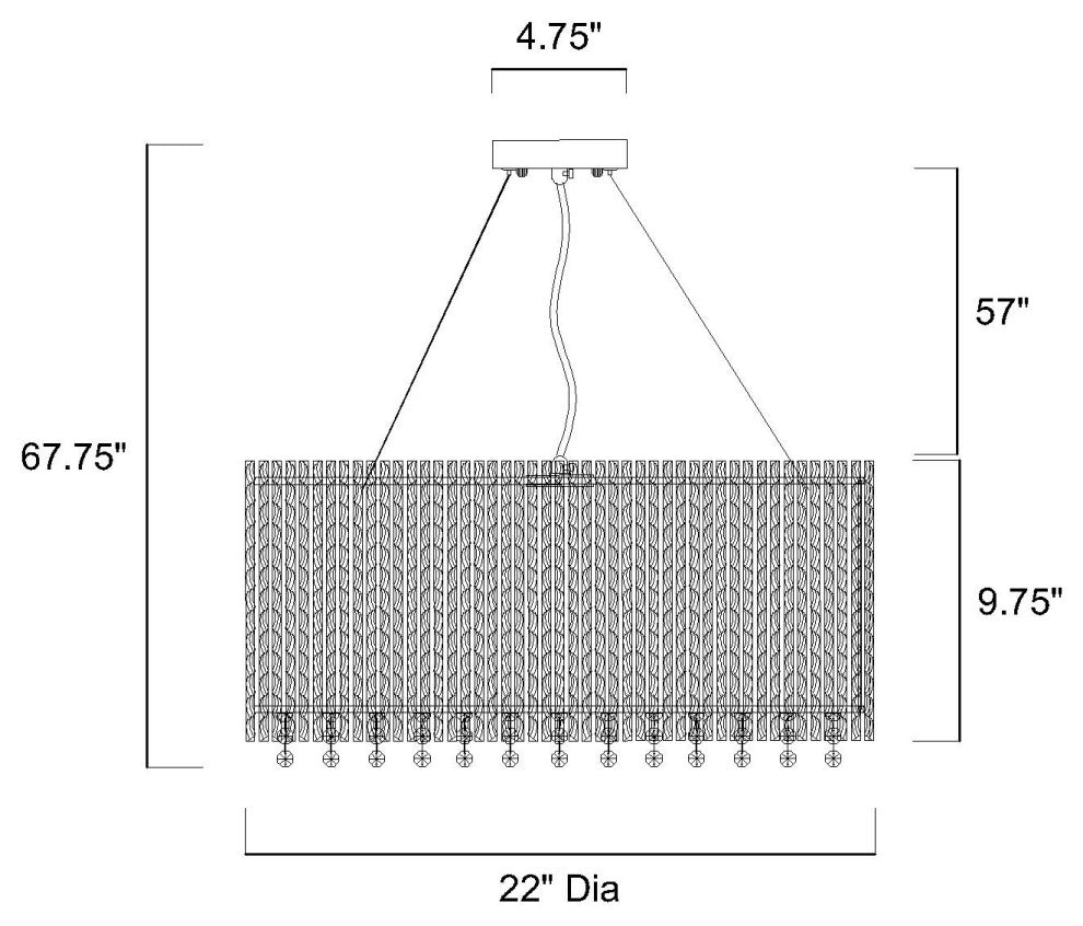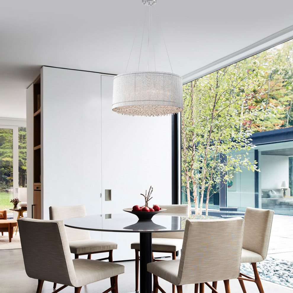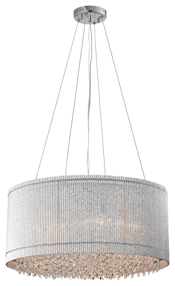 This modern and contemporary 5-light chandelier features etched chrome and sparkling crystal strands that add glam lighting to the home. The classic drum chandelier shade is formed by etched tubes that surround the bulbs to reflect the lights and crystals. The shiny chrome finish of this crystal chandelier complements contemporary furnishings for a timeless appearance. Hanging by four 59 in. wires, this light fixture may be adjusted to suit any ceiling height. The chrome finish, crystal strands, and drum shape make this light the perfect lighting solution as an entryway, dining room, or bedroom chandelier.