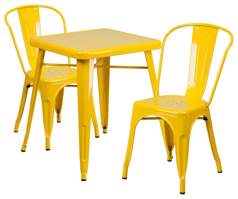 23.75" Square Yellow Metal Indoor-Outdoor 3-Piece Table Set With 2 Stack Chairs