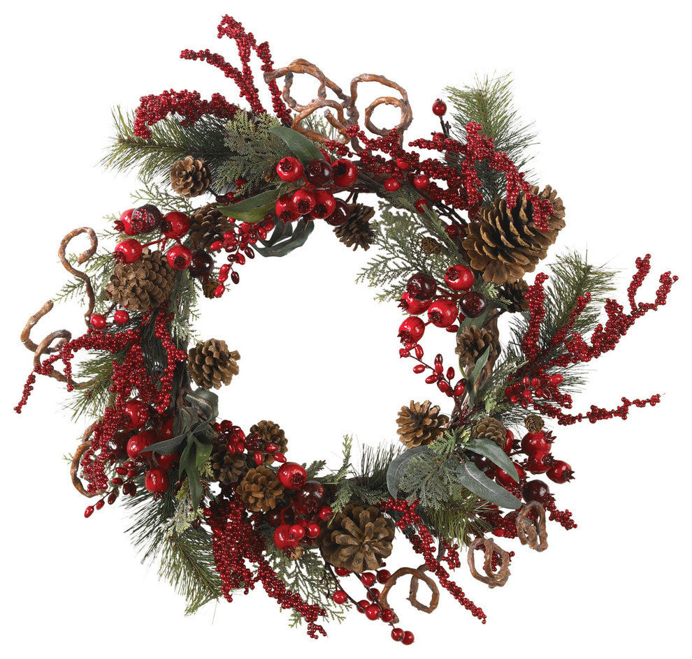 You"ll have the birds chirping at your door this holiday season with this vibrantly colored masterpiece. A rich mix of luminous berries creates a warm glow that''s guaranteed to capture your eye. Lush foliage surrounds the base of this brilliantly styled wreath adorned with a festive topping of pinecones and sprigs. A full two feet in diameter, this lovely arrangement makes a wonderfully thoughtful gift for family or friends.