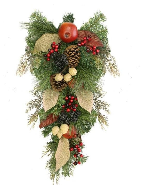 Bursting with unique berries | nuts and pine cones over a mixed pine base | this teardrop swag is perfect for Thanksgiving | Halloween or autumn in general | Features red berries | pomegranates | blackberries | pine cones and several clusters of walnuts | Unlit | Comes ready to hang on a metal loop | Recommended for indoor use | Dimensions: 24"H x 12"W x 4"D | Material(s): plastic/pine cone/foam/wire