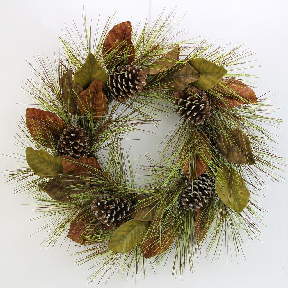 24" Faux Magnolia Leaves and Glitter Pine cone Christmas Wreath