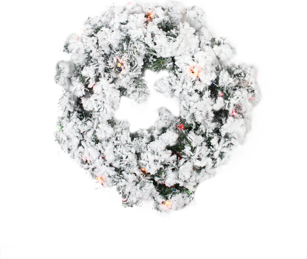 Features a heavy white flocking on 2.5" wide green pine needles. It''s the ideal way to add classic holiday style to your front door or mantle | Product Features: | Pre-lit with 50 multi-color lights | 120 mixed tips | 2.5" wide tips | No assembly required - wreath comes in 1 piece | Includes a heavy duty ring metal frame backing for hanging | Flame retardant | Additional Product Features: | Light sets on the wreath are UL listed for indoor or outdoor use however the wreath itself is recommended for indoor use | If one bulb burns out the rest will stay lit | Lights are equipped with Lamp Lock feature which makes them replaceable interchangeable and keeps them from falling out | Contains 1 plug with end connector which allows you to stack multiple lighted items together (not to exceed 210 watts) | Comes with replacement bulbs and spare fuses | Dimensions: 24" diameter (measured from outermost tip to outermost tip across the wreath) | Material(s): PVC/metal