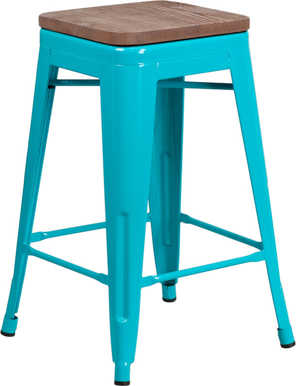 24" High Backless Crystal Teal-Blue Counter Height Stool With Square Wood Seat