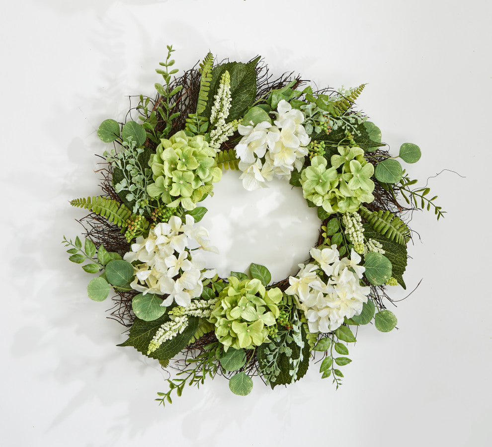Get ready for spring with this beautiful hydrangea wreath. The wreath features gorgeous green and white blooms along with assorted green leaves and fern.. It is set upon a rustic, swirling twig base.