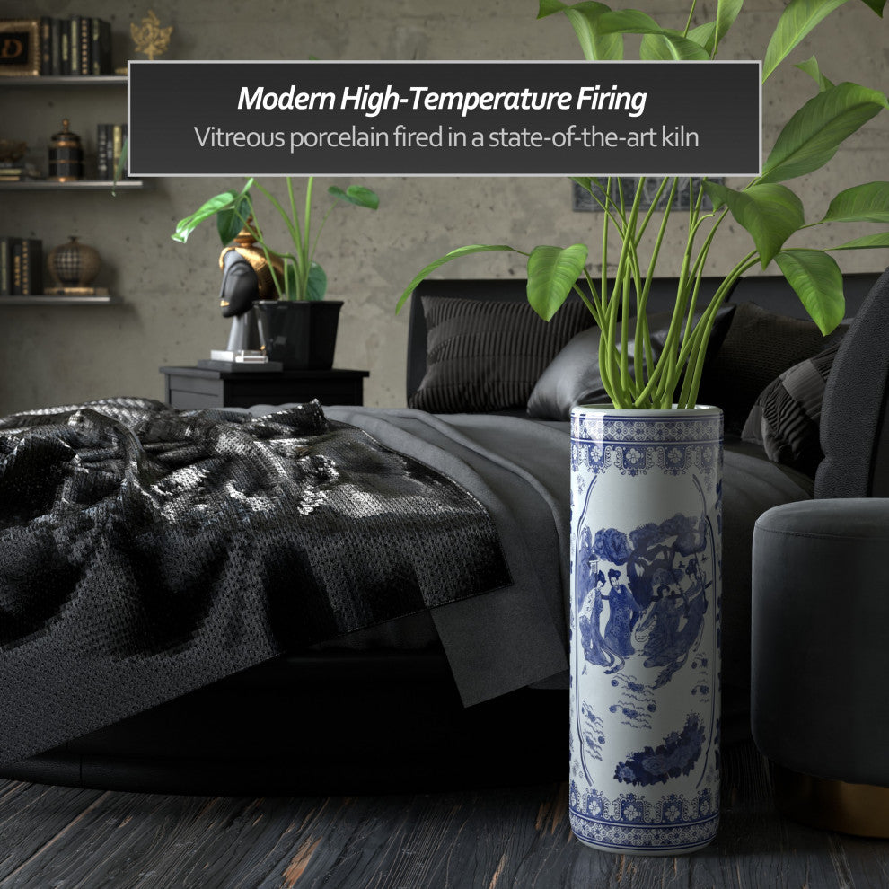 Tall cylinder shaped umbrella stand or floor vase crafted from high grade high temperature Chinese porcelain ceramic. Ming dynasty style court courtesan art motif; perfect for storing canes, walking sticks, and umbrellas.