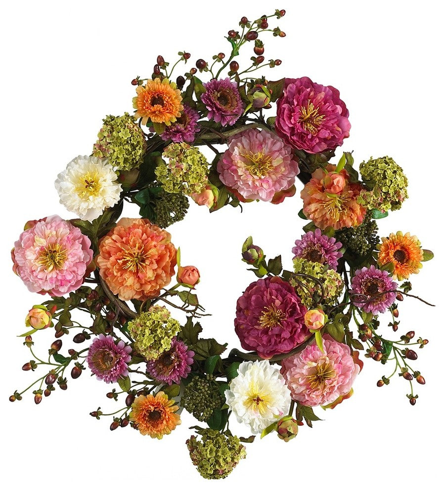 Looking for the perfect focal point to spruce up your front door or entryway? At 24 inches round, this lush peony wreath demands attention. A mixture of bright and cream colored pastels, this elegant creation brings flair to any space it graces. Rich foliage surrounded by authentic crafted stems and a sprinkle of berries add further compliment to this masterpiece of nature.