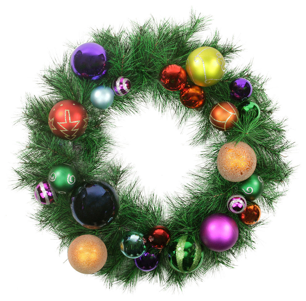 Realistic artificial long needle pine wreath is beautifully decorated with multi-color ball ornaments in varying sizes and finishes | Product Features: | Unlit | 3"? wide tips | For indoor use only | No assembly required - wreath comes in 1 piece | Includes a heavy duty ring metal frame backing for hanging | Dimensions: 24" diameter (measured from outermost tip to the opposite side''s outermost tip) | Material(s): PVC/plastic