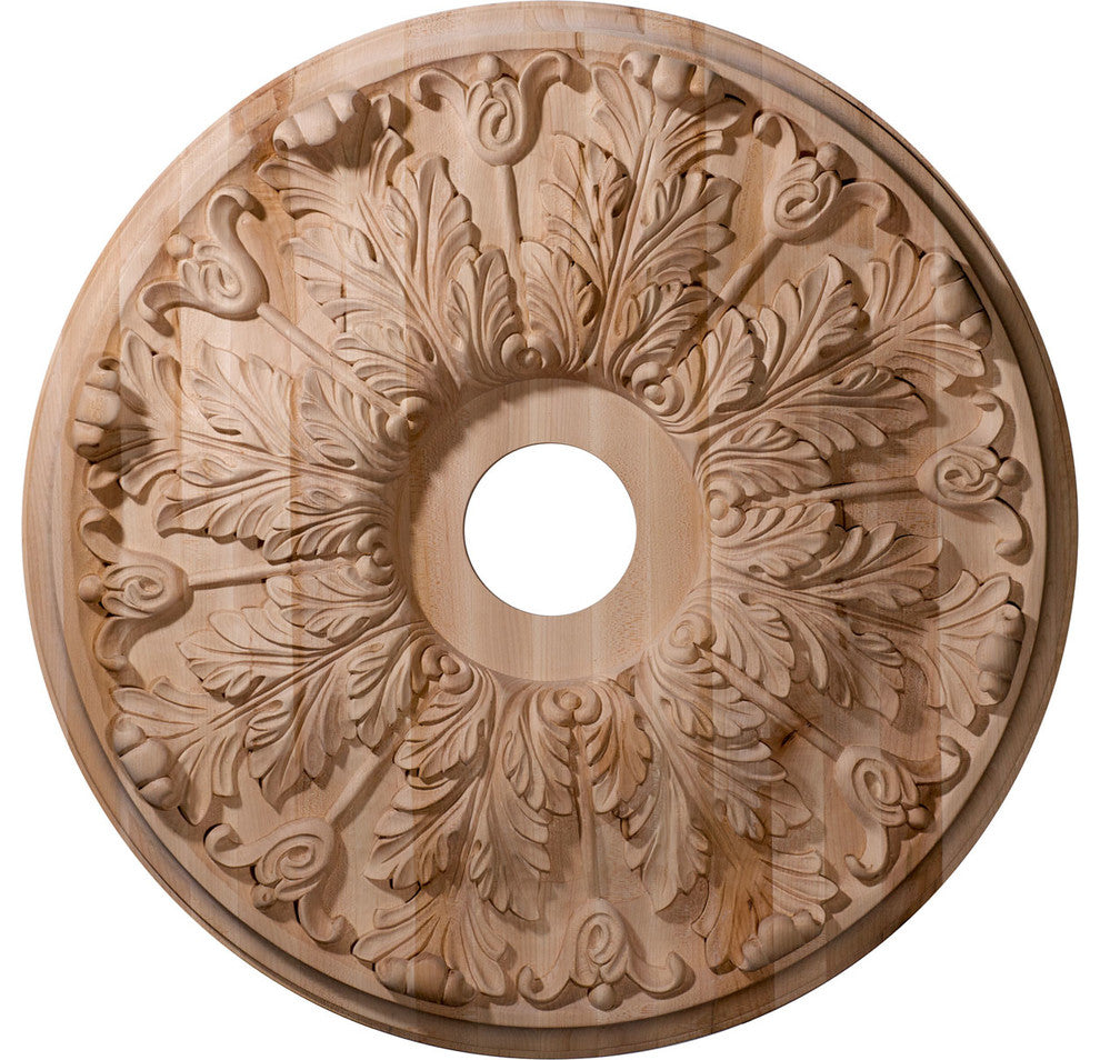 24"OD x 2 1/4"P Carved Florentine Ceiling Medallion, Red Oak. Enjoy the warmth and beauty of a real wood ceiling medallion. All of our wood ceiling medallions have been hand carved by master carvers to give the authentic beauty of hand carving. These medallions are fully sanded and ready for your paint or stain.