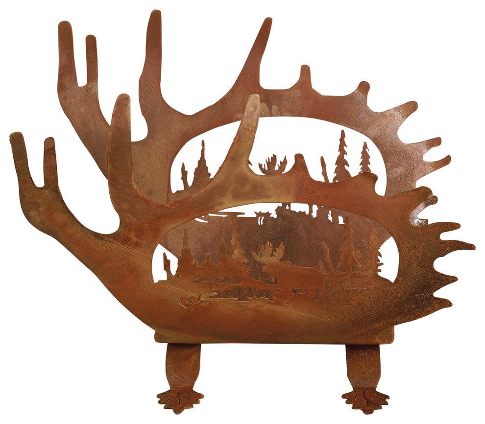 A picturesque scene of a Moose in the woods is framed by a rack of antlers in this firewood log rack with a Black finish. The fireplace accessory is handcrafted in the USA by Meyda artisans.