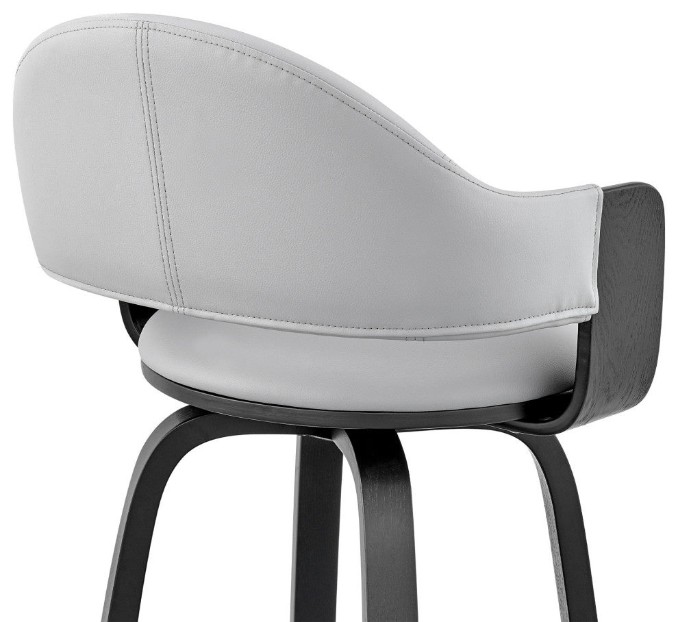Set up your home with some next-level stylish design with this 26" Rich Grey Faux Leather Bar Stool with Black Wood. The stool live up to its name as it is adorned in rich faux leather that is perfectly contrasted by its black wood frame that runs down to the base to provide a very strong support for the entire stool structure so you can conveniently sit knowing that the stool can and will hold your weight. The seat is cushioned and well padded with high-density foam that provides enough comfort. The metal footrest sits perfectly between the wooden legs and that only shows how the different elements featured in this chair combine well to make it a masterpiece. Its 360-degrees swivel function can make you turn to any direction with ease. 36 x 20 x 20